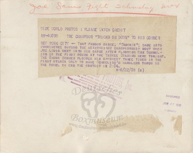 Size/Maße: 9'' x 7.1'' / 22,8 x 18 cmJoe Louis - Max Schmeling - The champion "Trucks on down" to his corner |