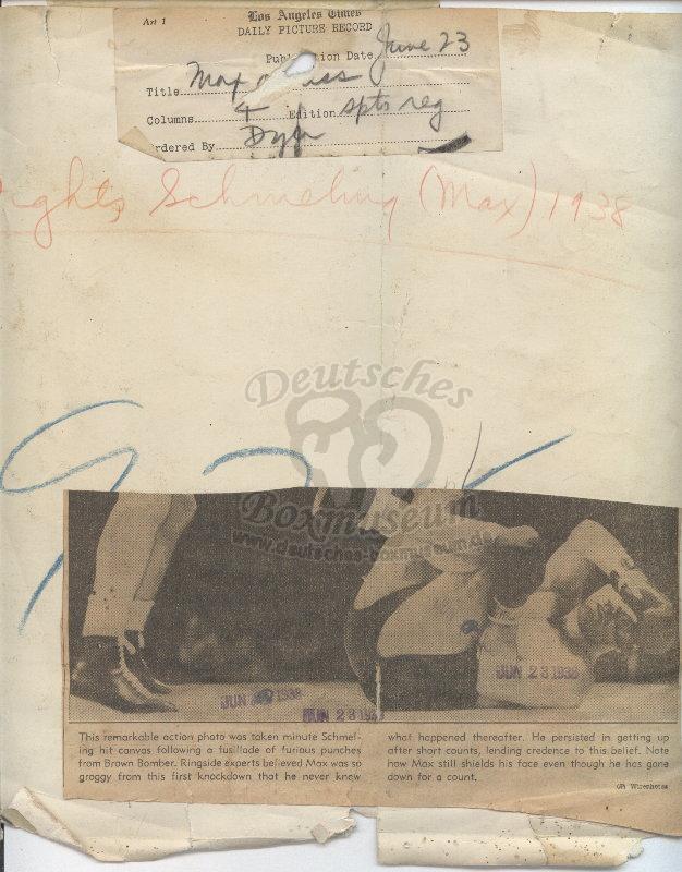 Size/Maße: 12.1'' x 10.6'' / 30,8 x 27 cmLos Angeles Times - Max Schmeling - Publication Date: JUNE 23 1938 - This remarkable action photo was taken minute Schmeling hit canvas following a fusillade of furious punches from Brown Bomber. Ringside experts believed Max was so groggy from this first knockdown that he never knew what happend thereafter. He persistd in getting up after short counts, lending credence to this beliefe. Note how Max still shields his face even though he has gone down for a count. |