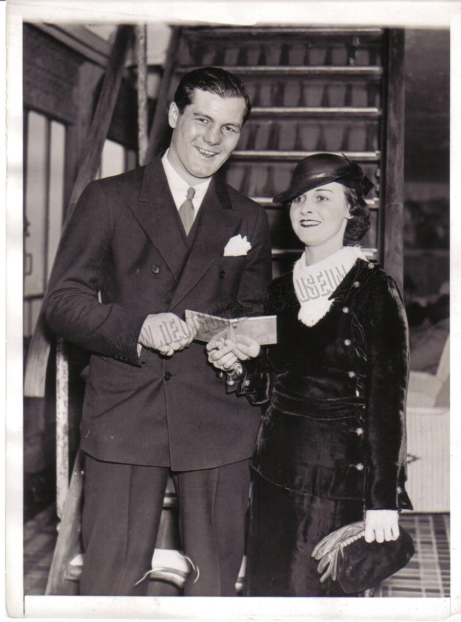 Bildtelegrammfoto vom 09.04.1935; Steve Hamas, Schwergewichtboxer, kommt nach dem kürzlich in Hamburg gegen Max Schmeling stattgefundenen Kampf, mit seiner Frau in New York an Bord der S.S. Ile de France an.
