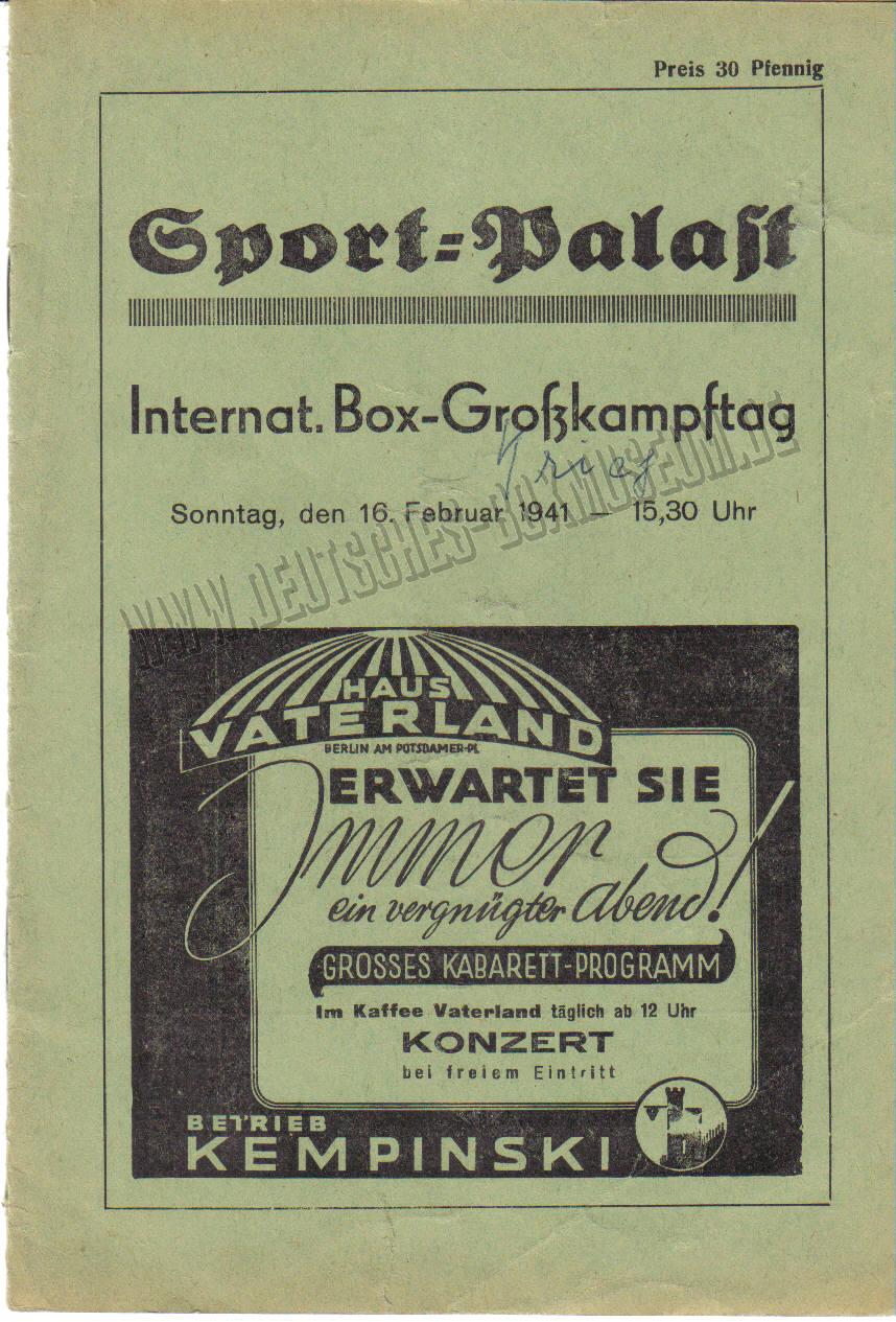 Sonntag, 16. Februar 1941, Berlin, Sport-Palast, Beginn 15.30 Uhr