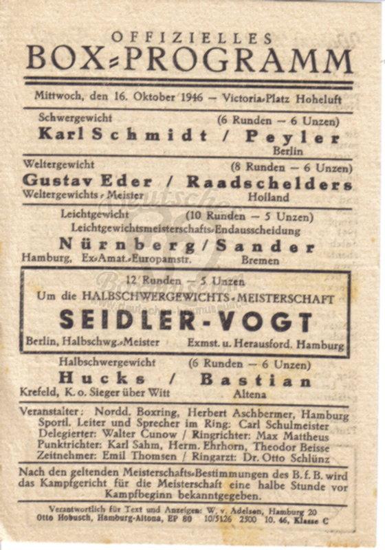 Schwergewicht Carl “Kuddel” Schmidt - Karl Pleyer PTS Schmidt 6 6 Weltergewicht Gustav Eder - Arnold Raadschelders PTS Eder 8 8 Leichtgewicht Herbert Nürnberg - Willy Schiers PTS Nürnberg 8 8 DM im Halbschwergewicht Heinz Seidler - Richard Vogt PTS Vogt 12 12 Halbschwergewicht Dietrich Hucks - Otto Bastian KO Hucks 2 6